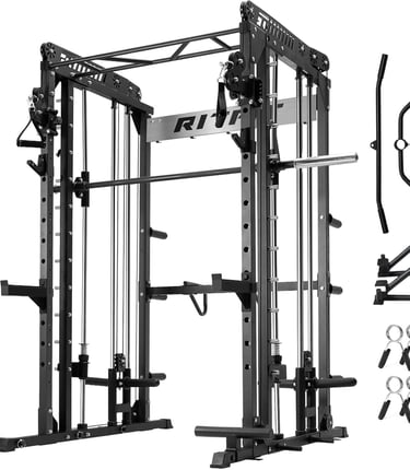 for squats, bench press, pull-ups, and full strength training at home. Strong steel frame, safety bars, and multi-function design make it perfect for serious home workouts without needing a commercial gym.